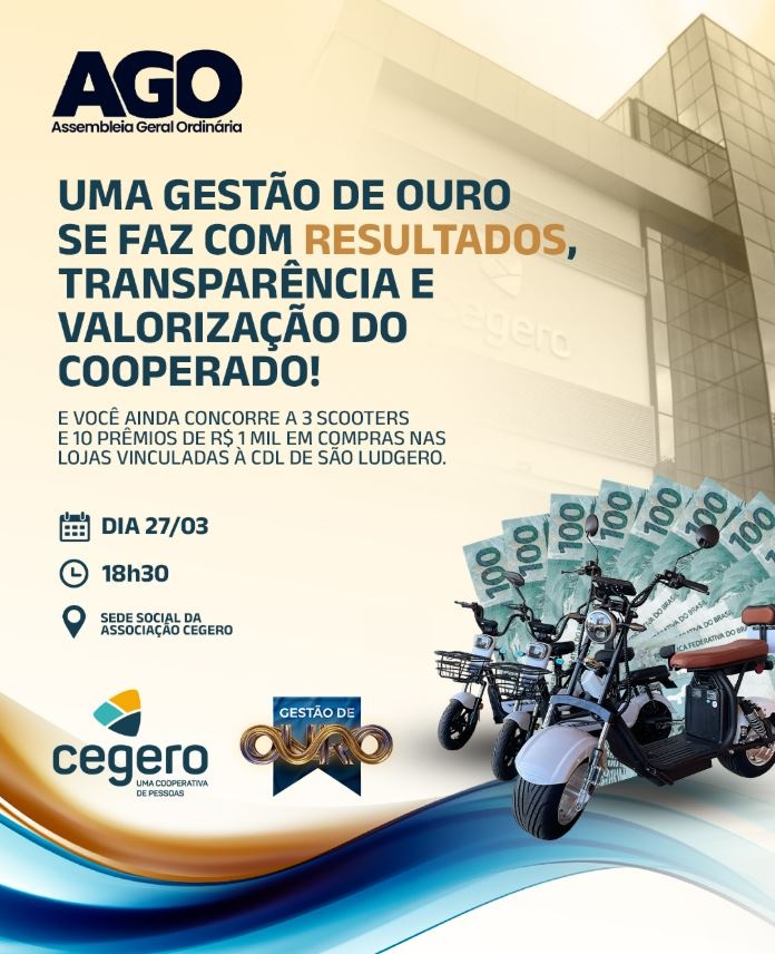 Uma boa notícia para os associados da Cegero: quem participar das Assembleias Gerais Ordinárias da Cooperativa de Eletricidade de São Ludgero (Cegero), da Cooperativa de Geração e Desenvolvimento de São Ludgero (Cegero GD) e da Associação Social e Recreativa Cegero (Associação Cegero), no dia 27 de março (sexta-feira), a partir das 18h30min, na sede social da Associação Cegero, estará concorrendo ao sorteio de três scooters e dez vale-compras no valor de R$ 1.000,00 cada.
