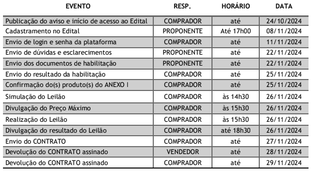 Segue abaixo o cronograma geral do LEILÃO CEGERO/COOPERZEM 2024-01: